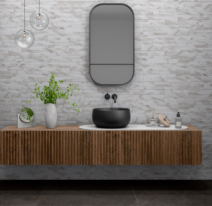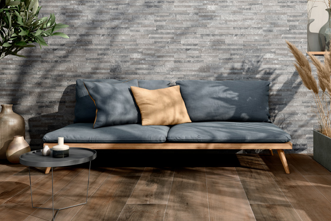 Πρόκειται για πλακίδια τοίχου, διαστάσεως 17×52, τα οποία έχουν ματ επιφάνεια και μοιάζουν με πέτρωμα και μάρμαρο.