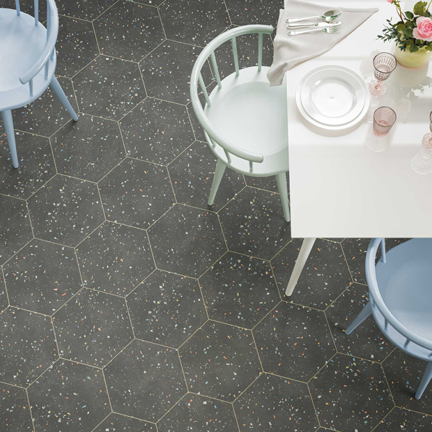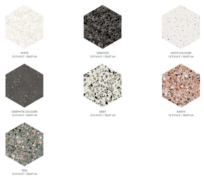 Πρόκειται για εξάγωνα πορσελανάτα γρανιτοπλακίδια, με διαστάσεις 12,5×14,5, τα οποία αποτελούν την νέα τάση για διακοσμητικά πλακίδια.