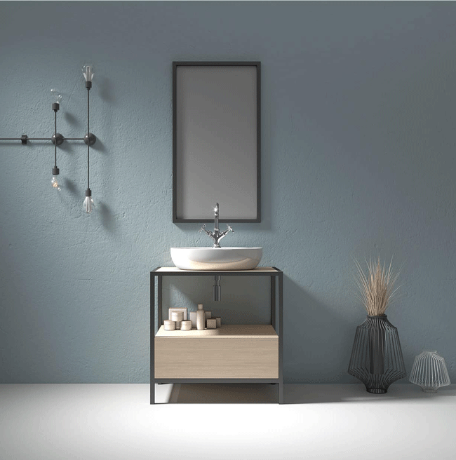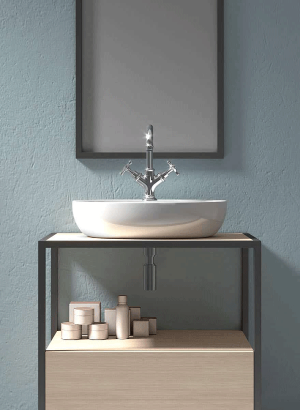 Το συγκεκριμένο έπιπλο είναι φτιαγμένο από μεταλλική βάση, ξύλο μασίφ δρυ και αποτελείται από τον πάγκο, τον νιπτήρα (μπορεί να αντικατασταθεί από οποιοδήποτε νιπτήρα πορσελάνης), τον καθρέπτη και την βαλβίδα χωρίς υπερχείλιση.
