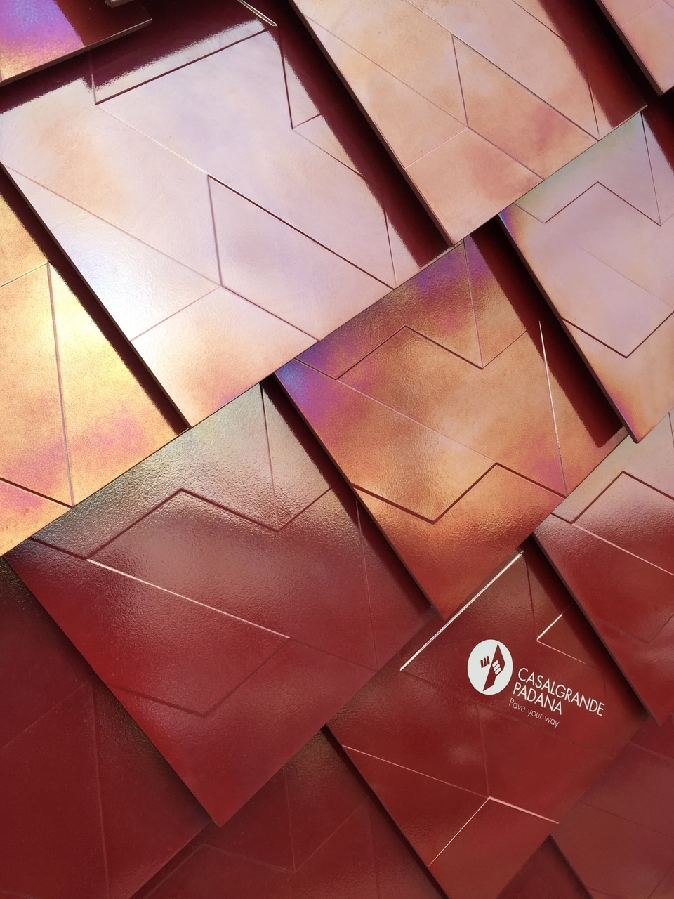 Το έντονο κόκκινο χρώμα και τα γεωμετρικά στοιχεία του πλακιδίου συνθέτουν μια μετα-μοντέρνα και γραμμική επιφάνεια.